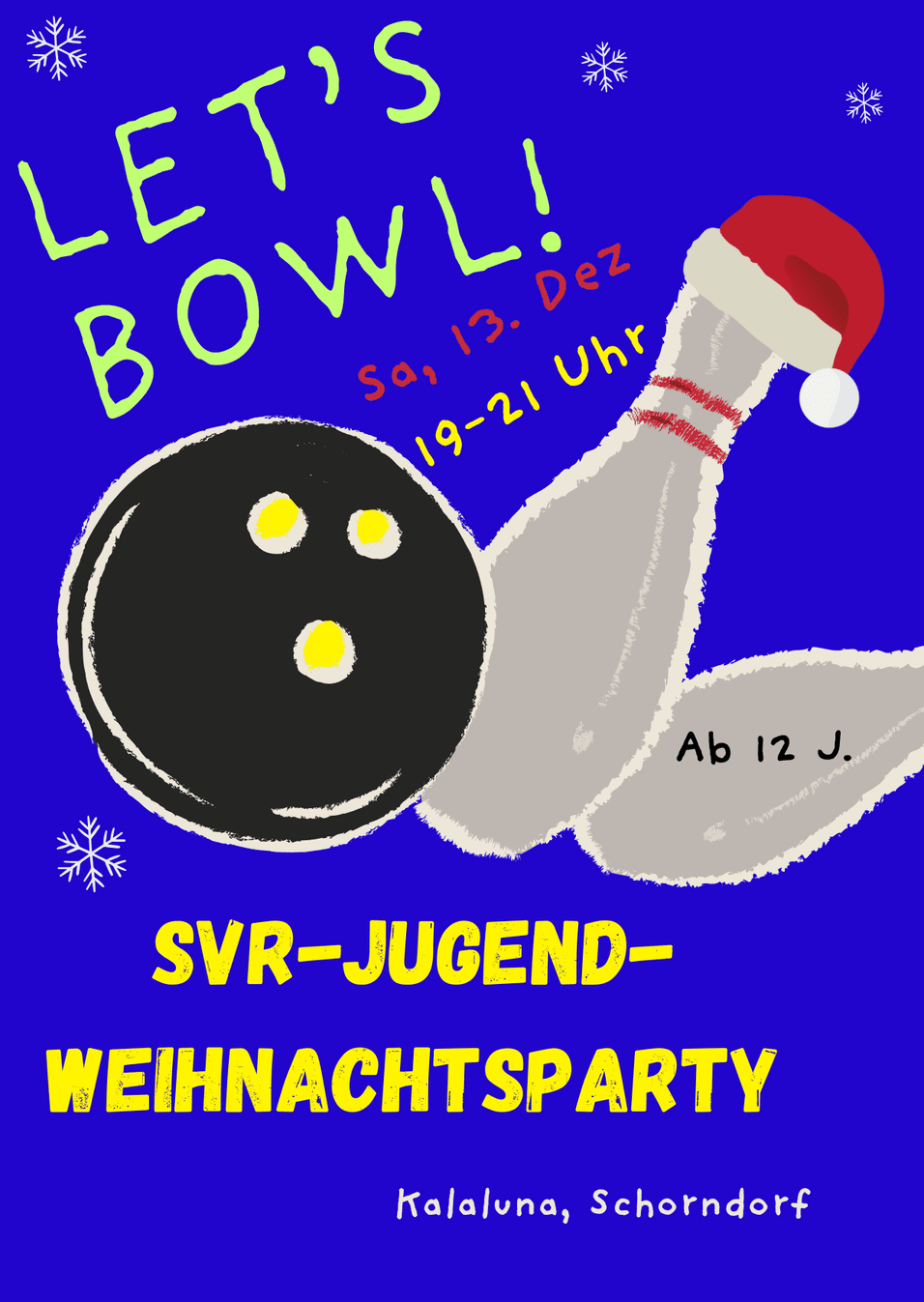 Am Sa, 13.12. findet eine Weihnachtsfeier nur für Jugendliche der SVR statt. Ihr seid 12 Jahre alt oder älter? Dann kommt zusammen mit uns von 19 bis 21 Uhr ins Kalaluna nach Schorndorf, um zusammen bowlen zu gehen. Wenn ihr gemeinsam mit der Bahn nach Schorndorf fahren wollt, treffen wir uns mit euch um 18:20 Uhr in Grunbach am Bahnhof direkt auf dem Bahnsteig, um von dort aus loszufahren. Natürlich könnt ihr auch gerne in Geradstetten in den vorderen S-Bahn-Wagen zusteigen. Denkt bitte an eure Fahrkarten. Alternativ könnt ihr auch selbstständig zum Kalaluna kommen. Gemeinsamer Start ist dort um 19 Uhr. Damit wir beim Bowlen alle Spaß haben und niemand sich verletzt, ziehen wir dort Bowlingschuhe an - das Geld dafür kommt von der SVR. Außerdem lädt euch die SVR ein auf ein Getränk eurer Wahl. Bringt also noch ein bisschen Geld mit, falls ihr dort etwas essen möchtet. Auf der Internetseite sv-remshalden.de und im WhatsApp-Kanal der SVR gibt einen Anmeldebogen. Den ausgefüllten Anmeldebogen gebt ihr bitte bis spätestens 6.12. beim Sportbüro ab / schreibt per Mail an kontakt@sv-remshalden.de Wir freuen uns auf euch!